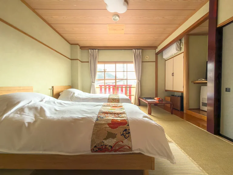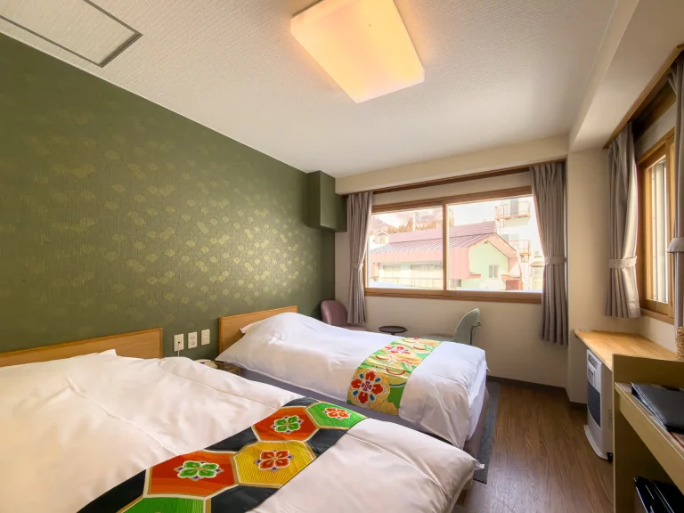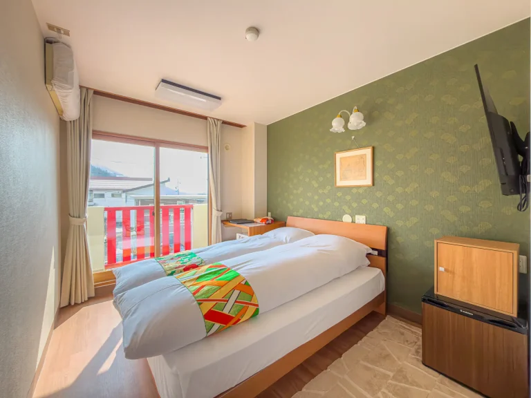 快適なツインルーム。シングルベッド2台、専用バス、トイレ付きです。2名まで宿泊可能。 ケトル、ティーバック、手作りマグカップ、インターネット、薄型テレビ、Bluetoothスピーカー、フリーWifi、金庫、ドライヤー、浴衣 アメニティー付きのバスルーム、お持ち帰り可能な温泉タオル。