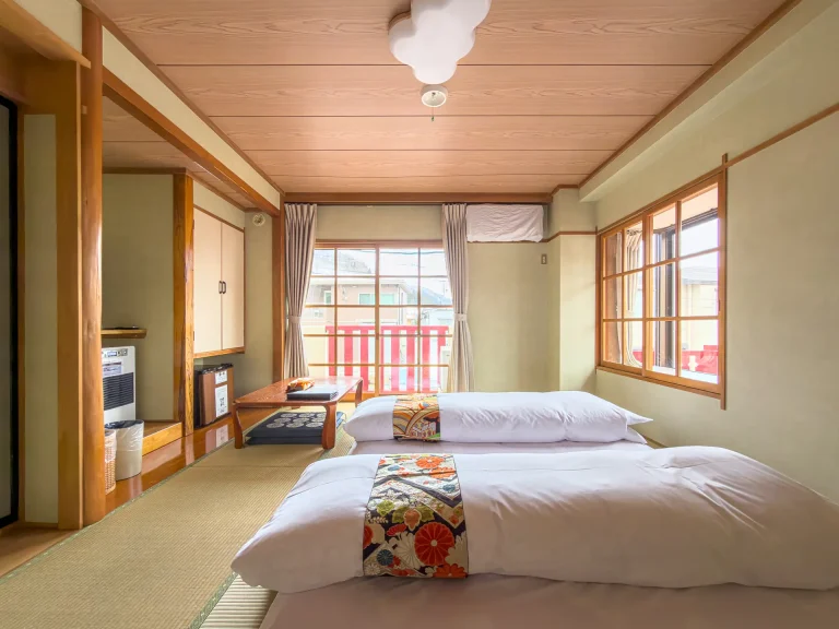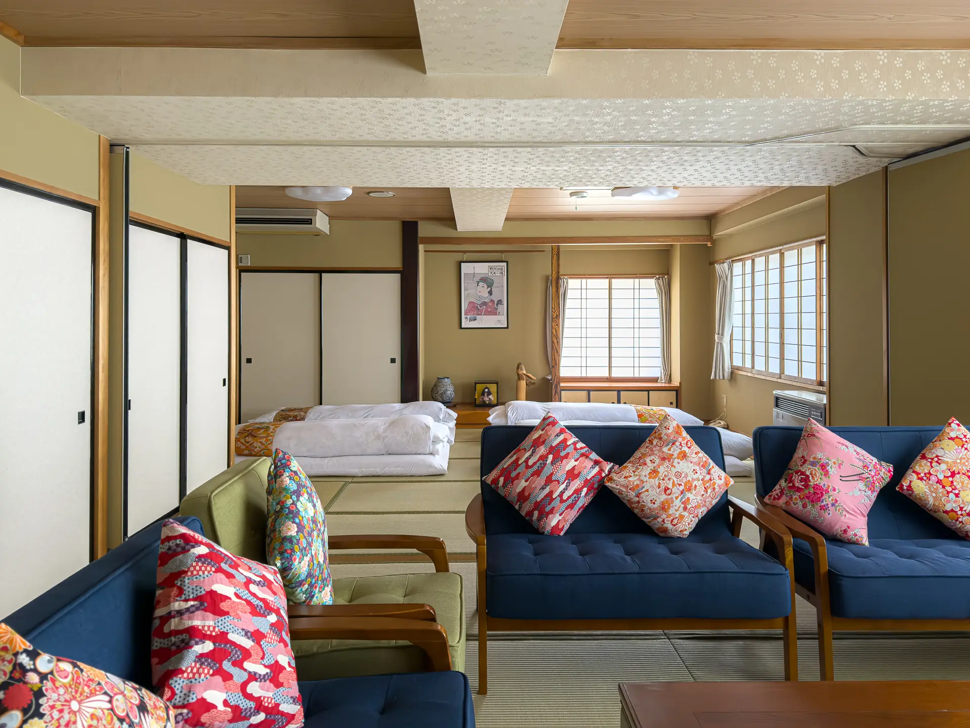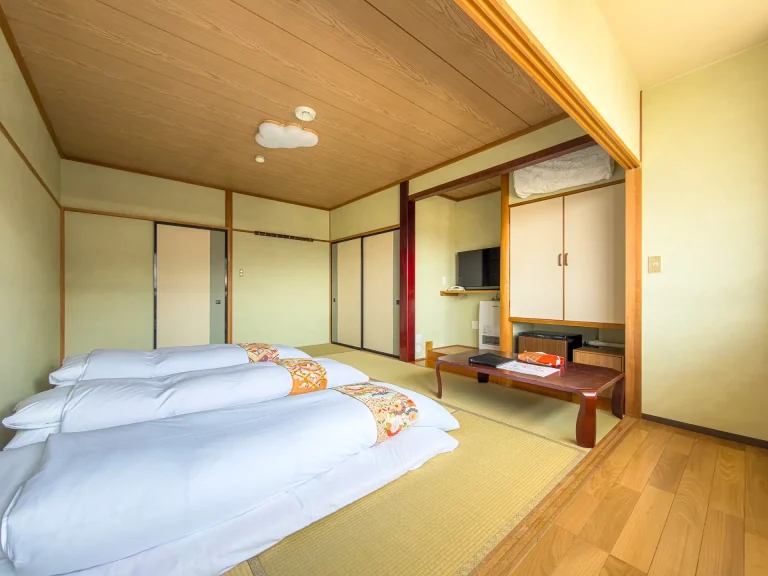 46平方メートルの広い和室。6名まで宿泊可能、リビングスペース、シャワー、トイレ付きです。 ケトル、ティーバック、手作りマグカップ、インターネット、薄型テレビ、Bluetoothスピーカー、フリーWifi、金庫、ドライヤー、浴衣 アメニティー付きのシャワールーム、お持ち帰り可能な温泉タオル。