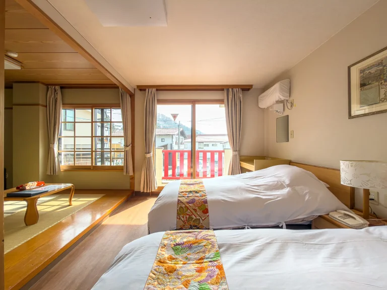 広い畳のお部屋にシングルベッド2台、布団2組を追加し4名様まで宿泊可能。 ケトル、ティーバック、手作りマグカップ、インターネット、薄型テレビ、Bluetoothスピーカー、フリーWifi、金庫、ドライヤー、浴衣 アメニティー付きのバスルーム、お持ち帰り可能な温泉タオル